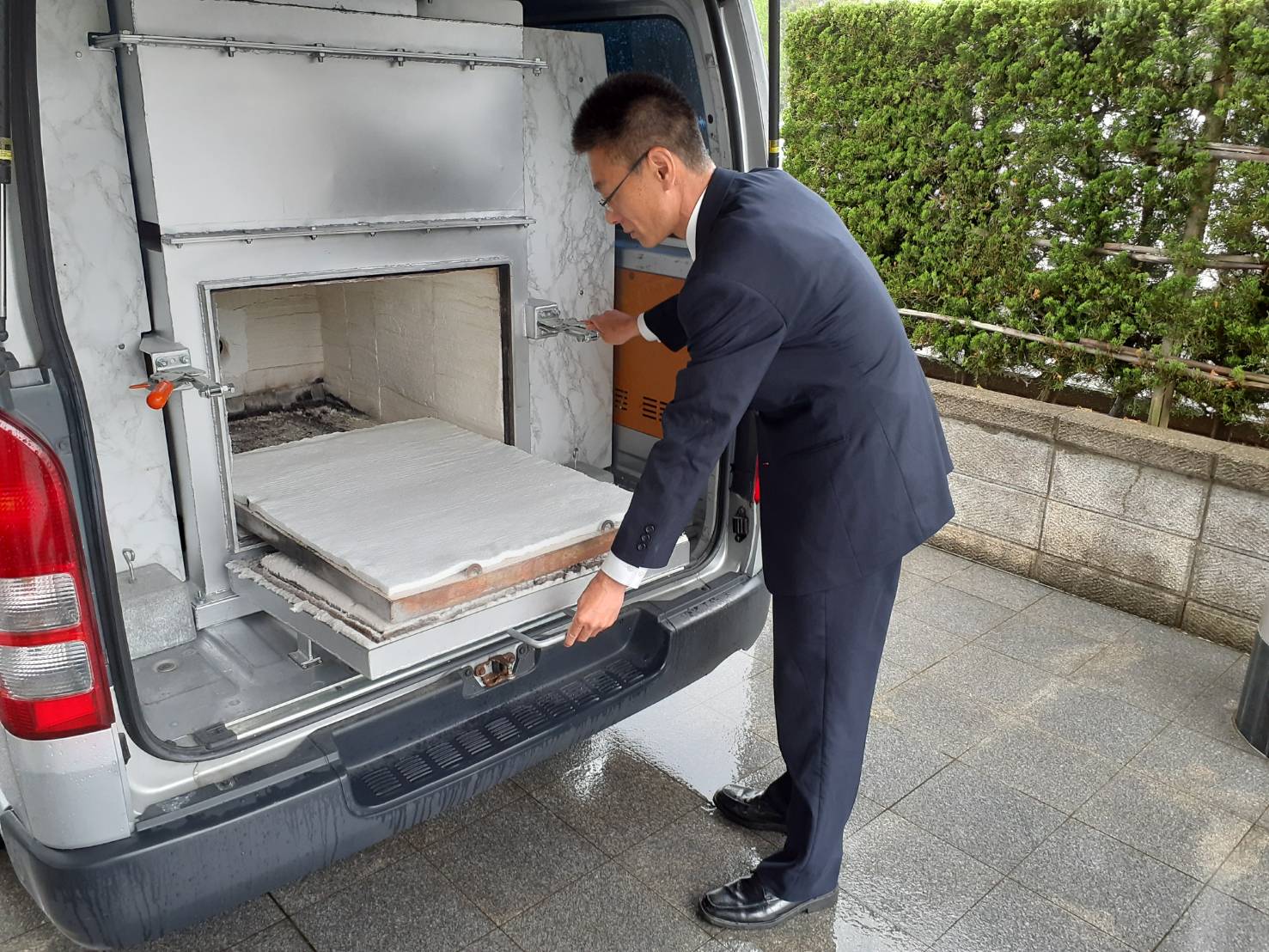 また、ペット火葬を行う際に使用をする専用の火葬車両については《臭いや煙のほとんど出ない最新式のペットさん専用の火葬炉》となっておりますので、近隣の方はもちろんのこと環境にも配慮した非常に安全かつ安心なペットさん専用の火葬炉を弊社では使用しております。